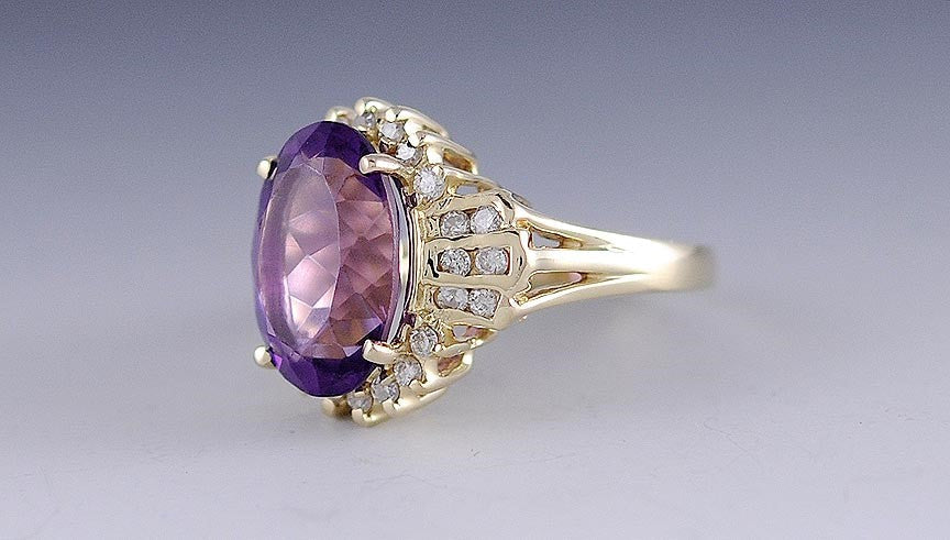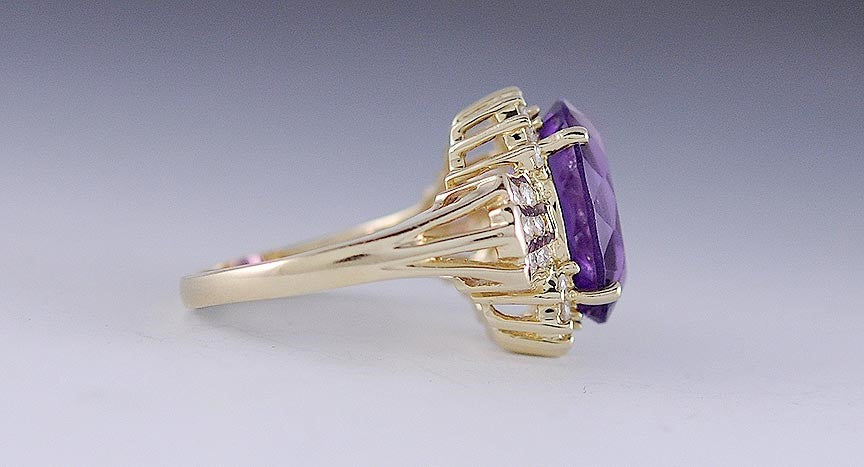 Around the amethyst are a total of 26 diamonds, channel set and prong set. The total diamond weight is about 30 points or 3/10 carat, with SI-2 to I-1 clarity and good H-I color.