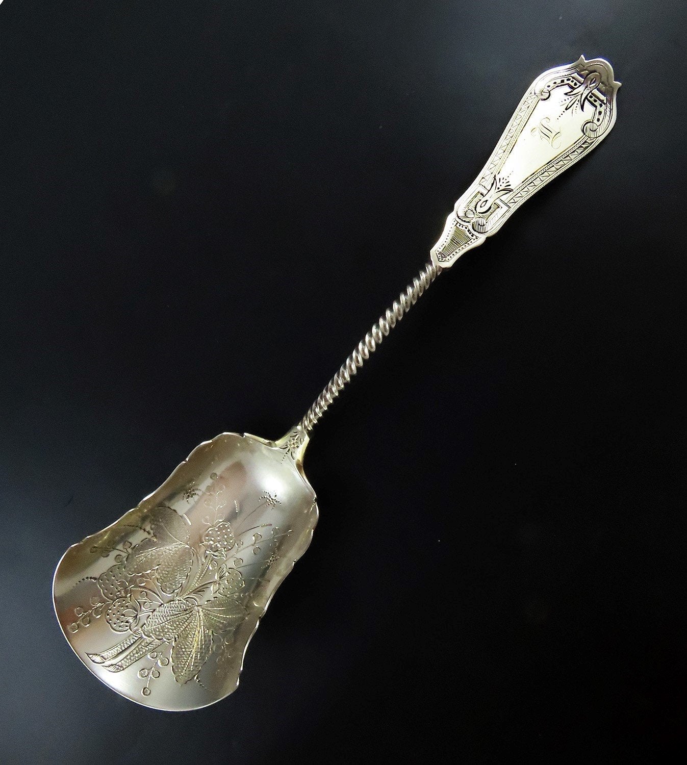Wonderful Late 1800s Coin Silver Cracker Scoop Strawberry Engravings 9 1/2"