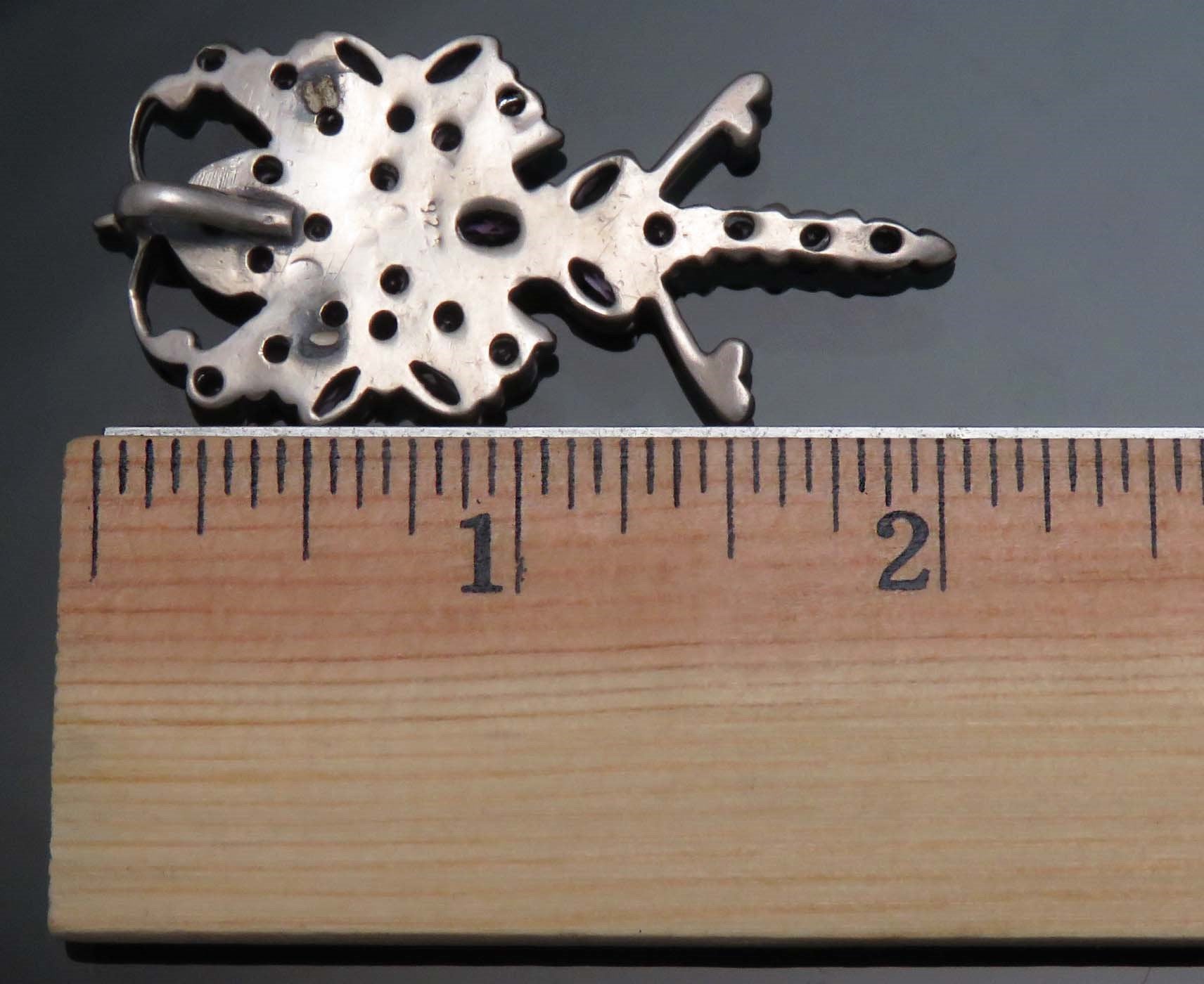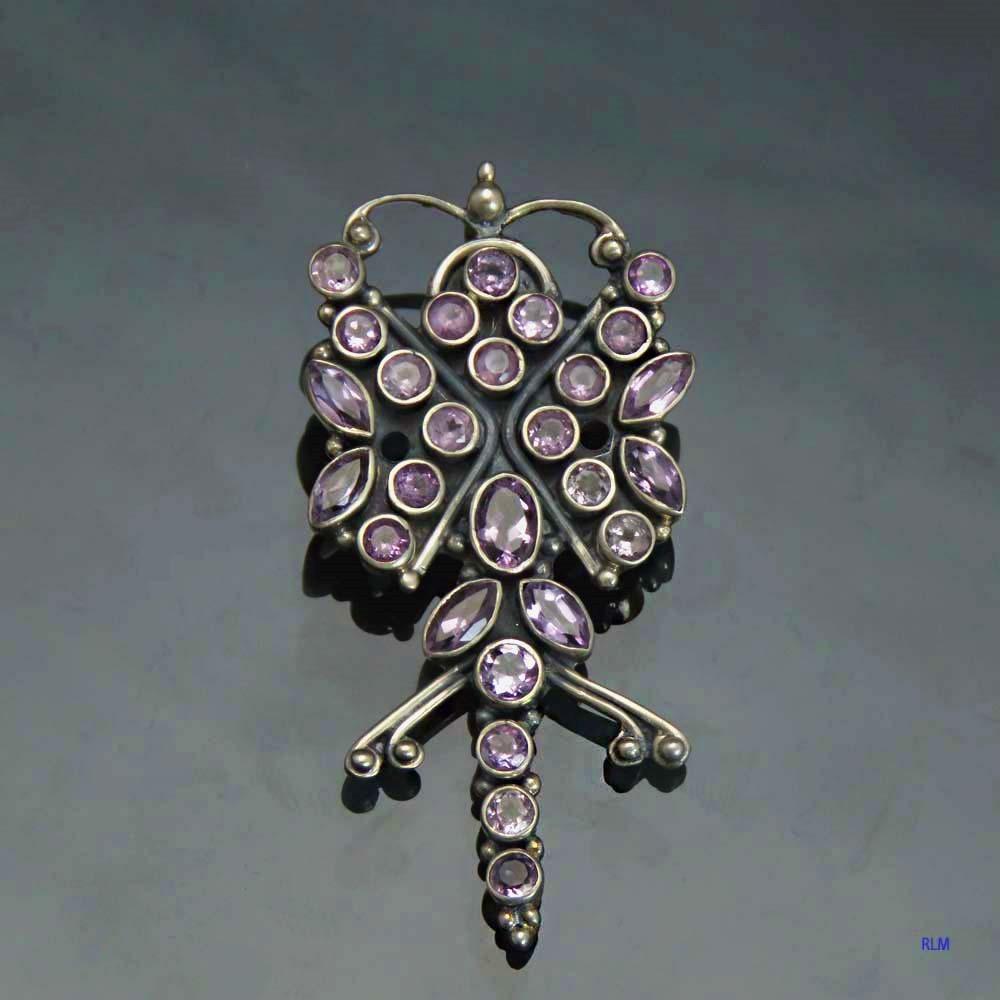 Presented is a lovely modern sterling silver amethyst dragonfly pendant. This piece is designed in the shape of a dragonfly. There are 27 amethysts throughout this piece. Let the photos be your guide.