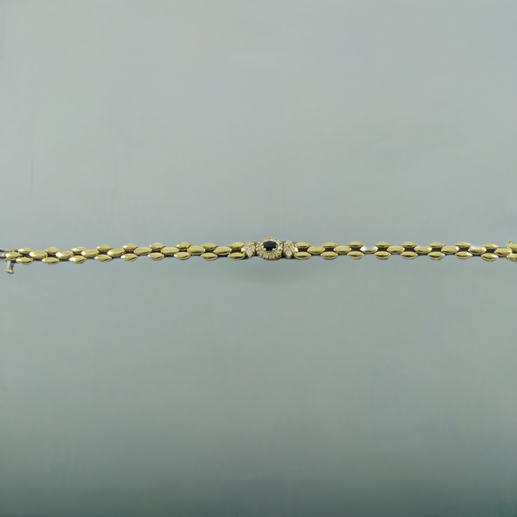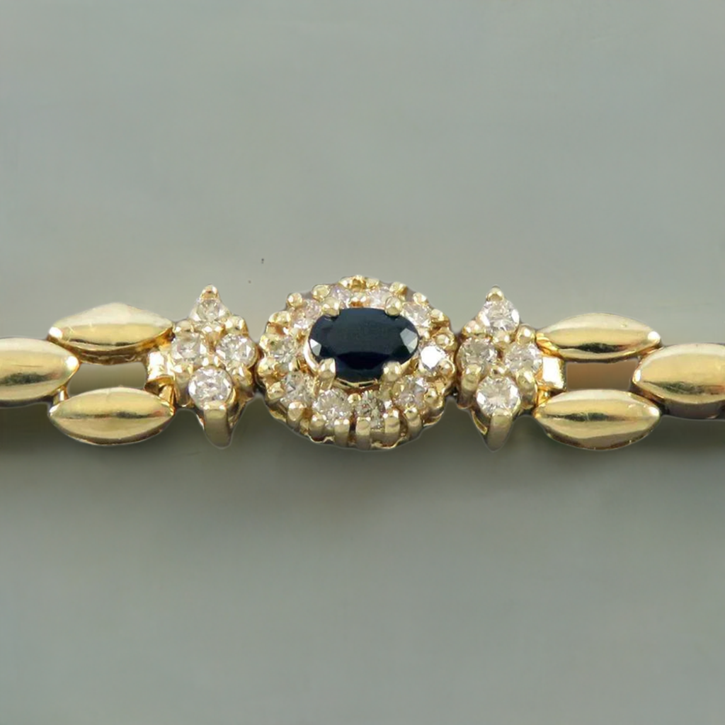 Presented is a high end, 14 karat yellow gold, natural sapphire and diamond gemstone bracelet. This lovely piece is comprised of oval linnks and the center has a decorative mounting that is securely set with a 15-20 point sapphire gemstone and 18 modern brilliant cut diamonds. The diamonds are SI clarity and H color, and there is approximately 45 points in total diamond weight. The plunger style clasp is secure and has a safety latch for added security.