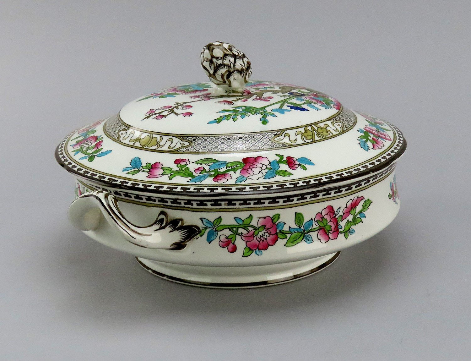 Presented is a beautiful porcelain china covered entree dish from S. Hancock & Sons. The piece is in the Indian Tree pattern with black key details and a gold trim. The base of the dish shows large pink flowers with green and blue leaves. The top of the lid shows the classic tree branch and a large pine cone finial.