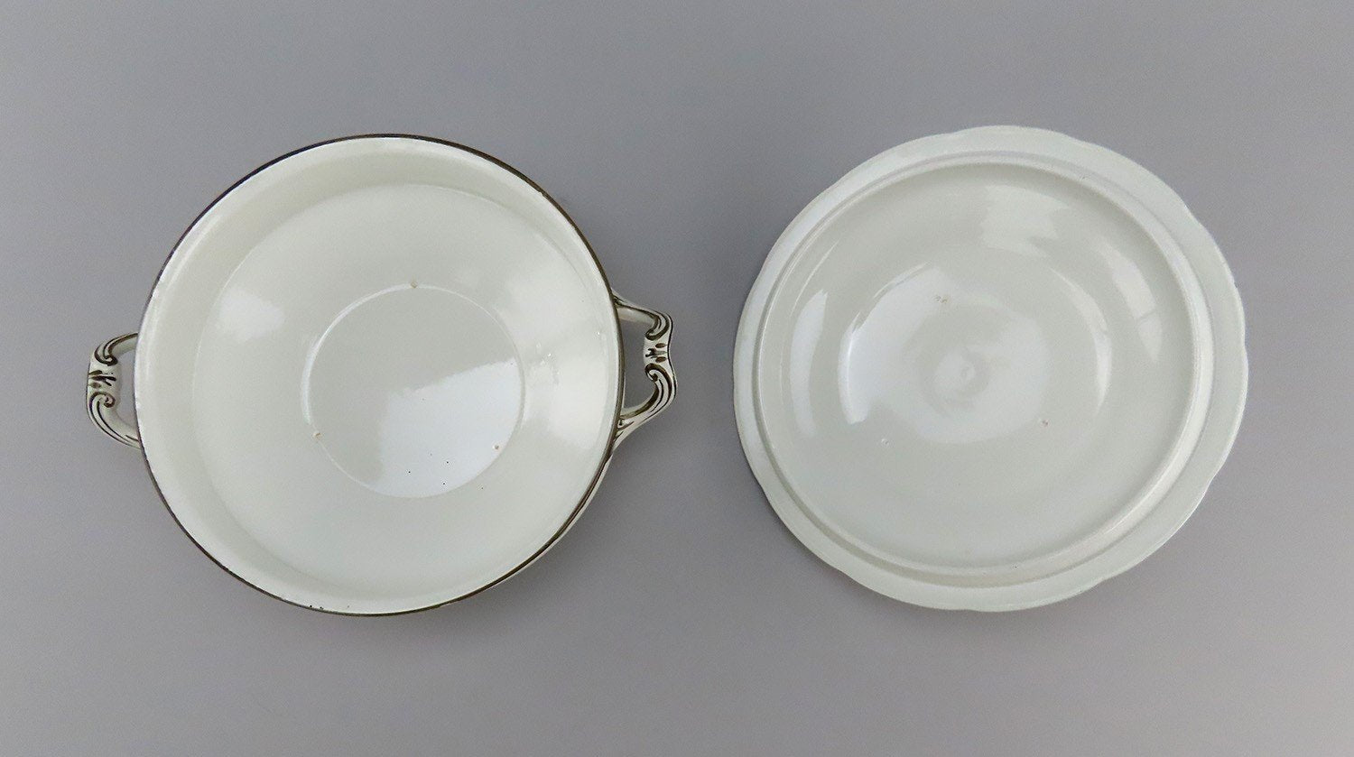 The dish is in great overall condition. There is some crazing to the glaze on both the dish and the lid. There are no breaks, no chips, and no repairs.