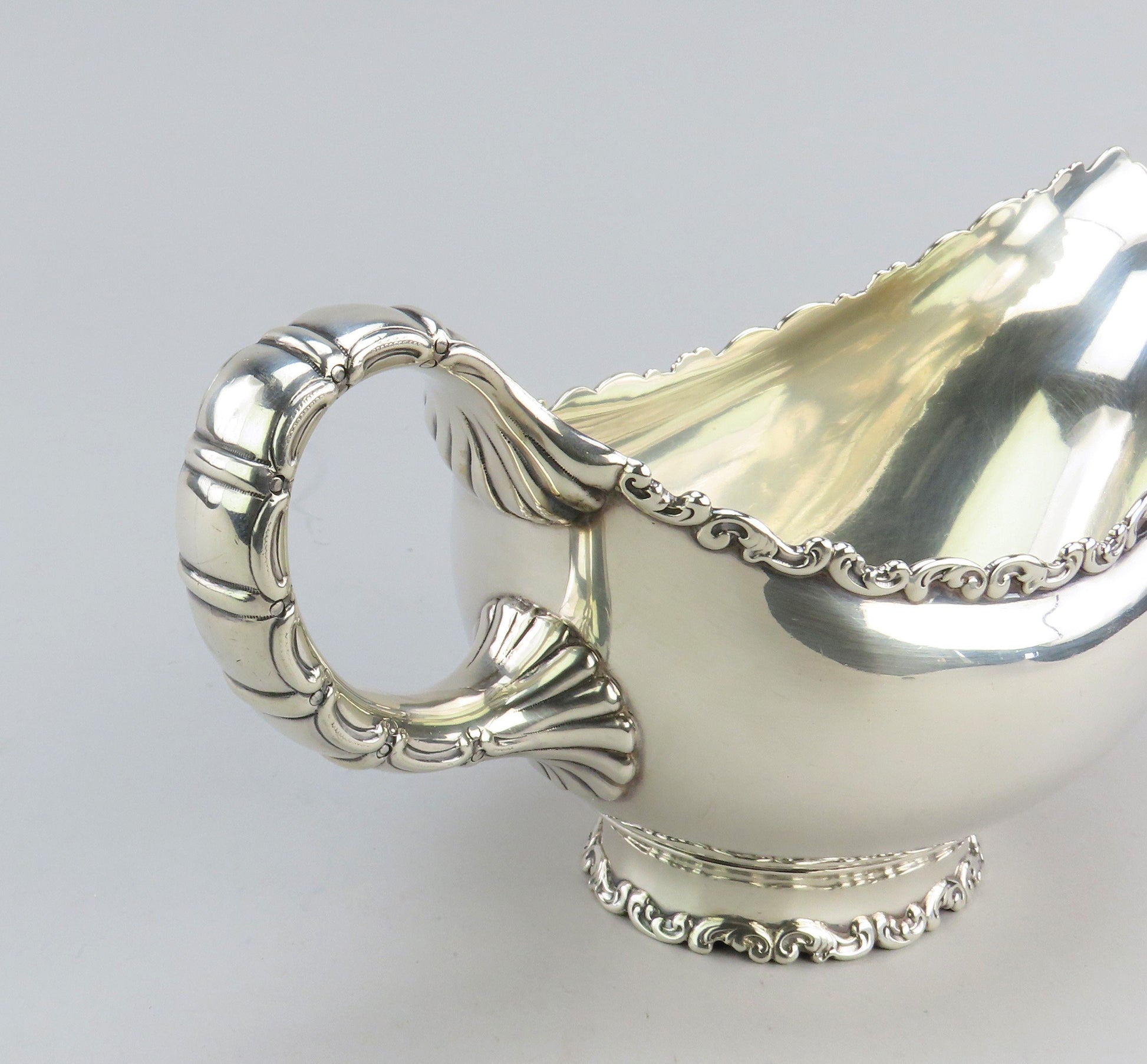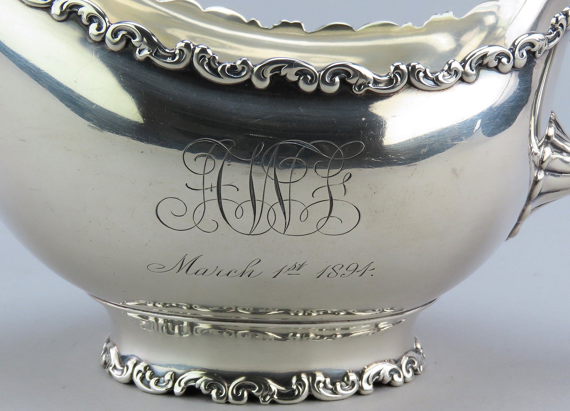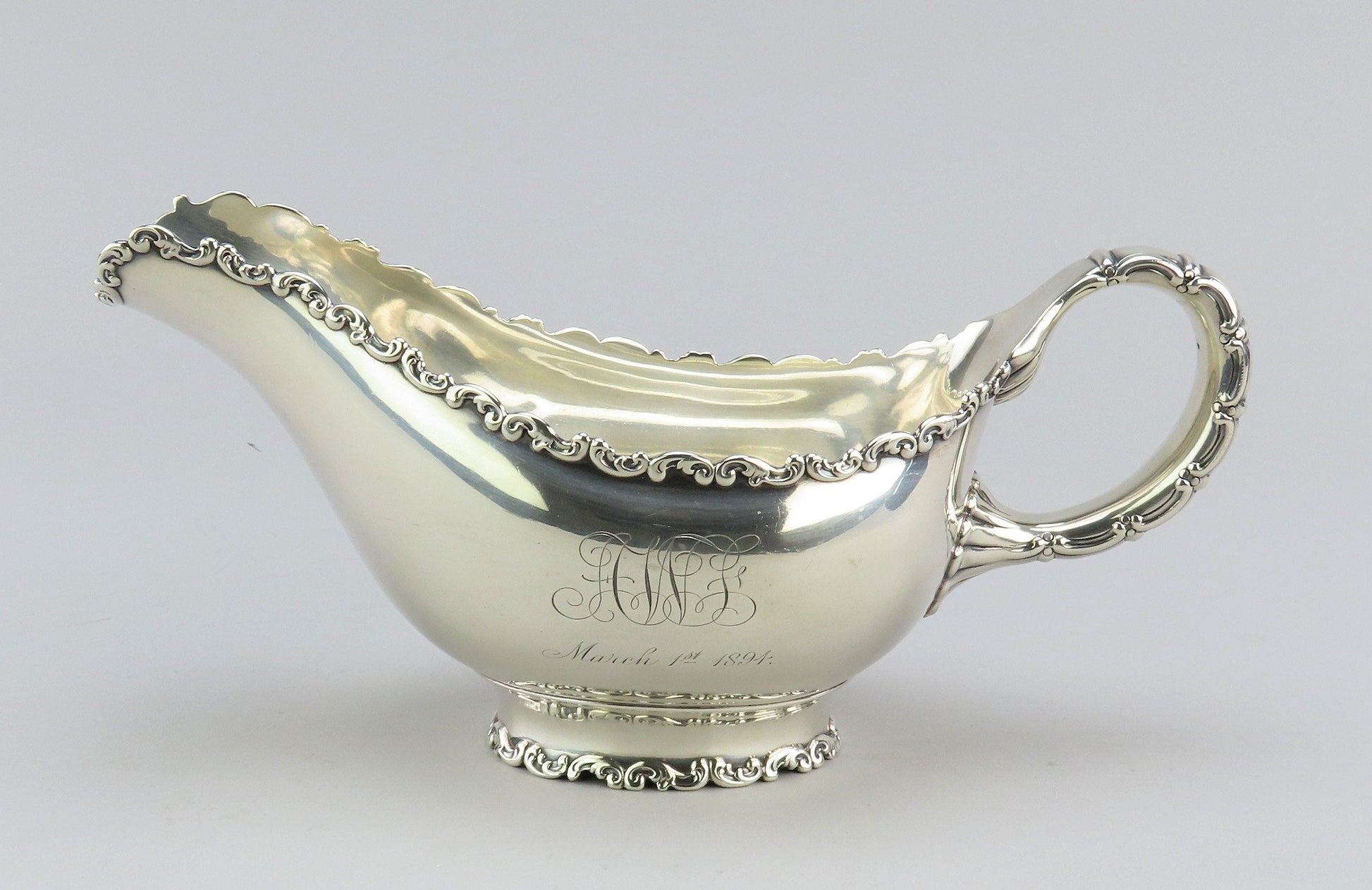 Presented is a wonderful sterling silver gravy boat from Whiting. This piece is in the Louis XV pattern, which was patented in 1891. This piece displays the classic scroll pattern details around the rim of the piece and around the foot. One of the sides is monogrammed, AWF in a flowing script and “March 1st, 1894”.