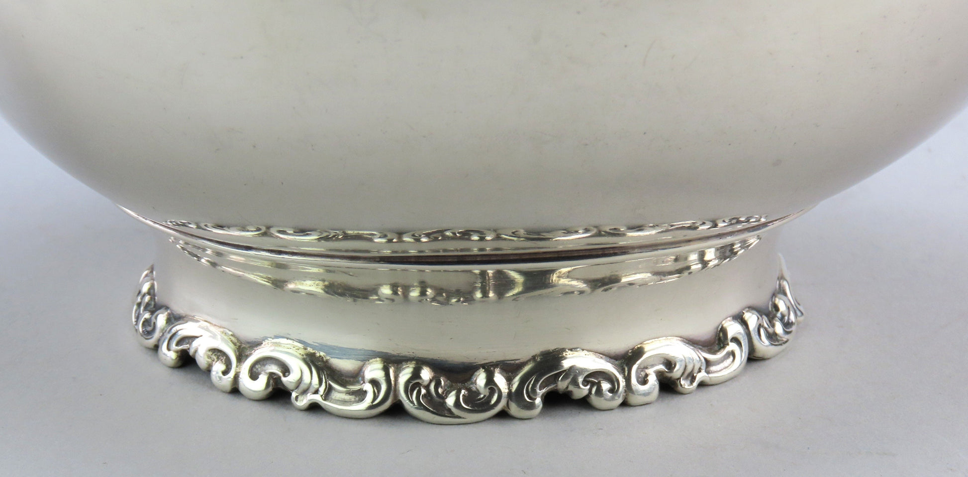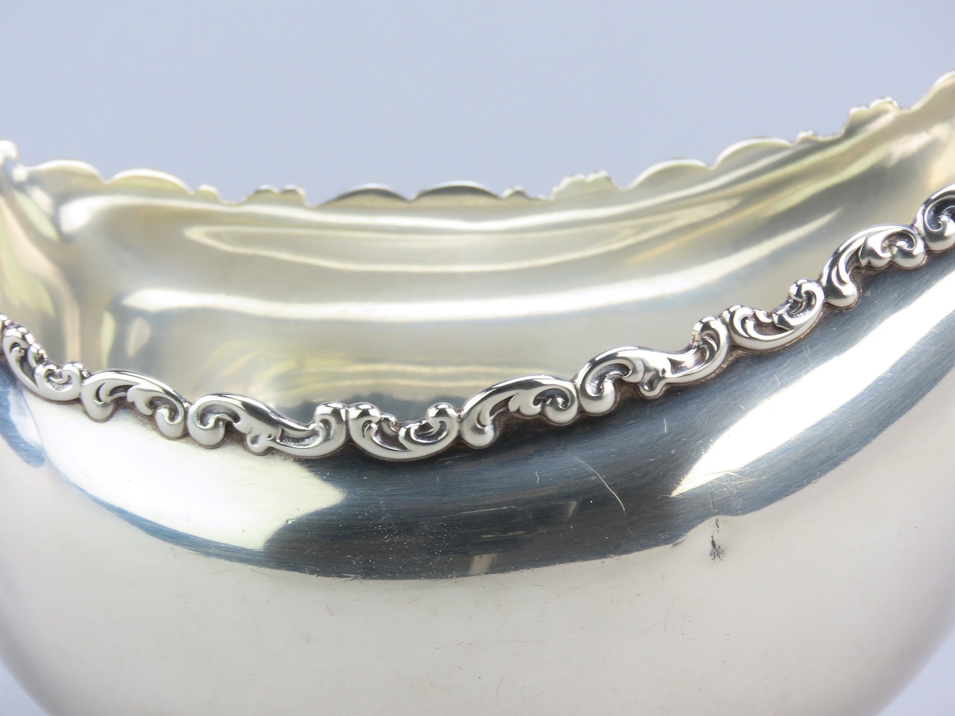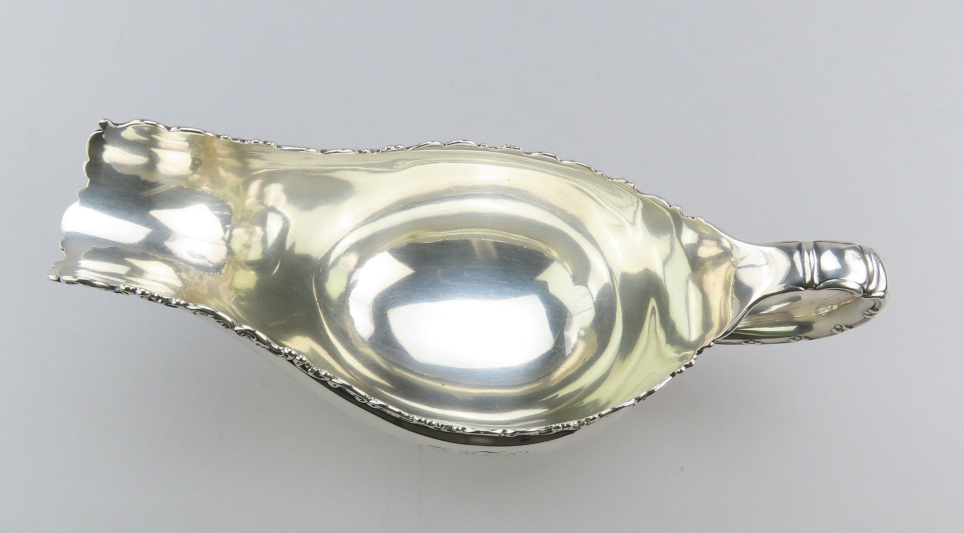 Presented is a wonderful sterling silver gravy boat from Whiting. This piece is in the Louis XV pattern, which was patented in 1891. This piece displays the classic scroll pattern details around the rim of the piece and around the foot. One of the sides is monogrammed, AWF in a flowing script and “March 1st, 1894”.