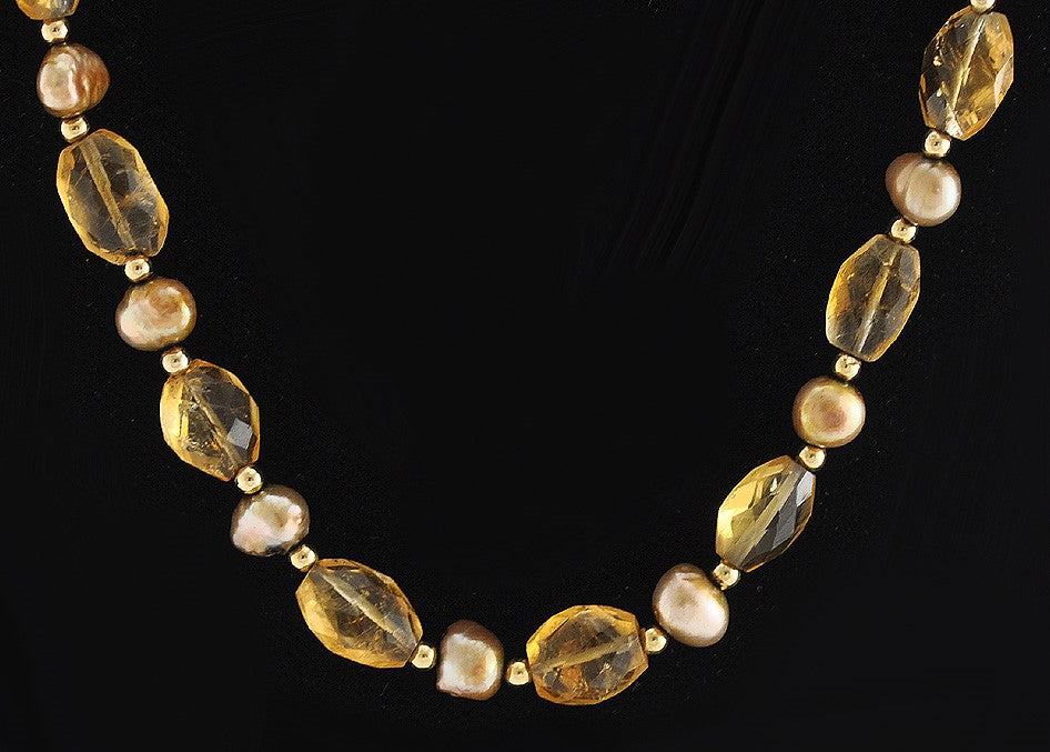 The yellow quartz beads are faceted and are separated by freshwater baroque pearls, likely dyed brown. A small, round 14k gold bead separates each bead.