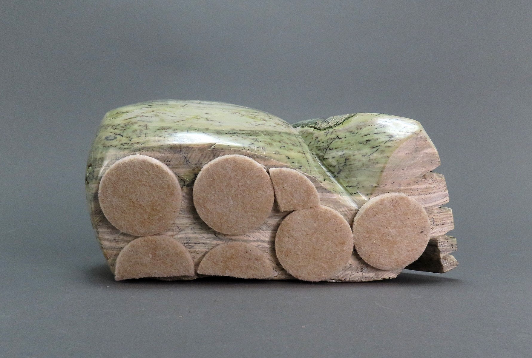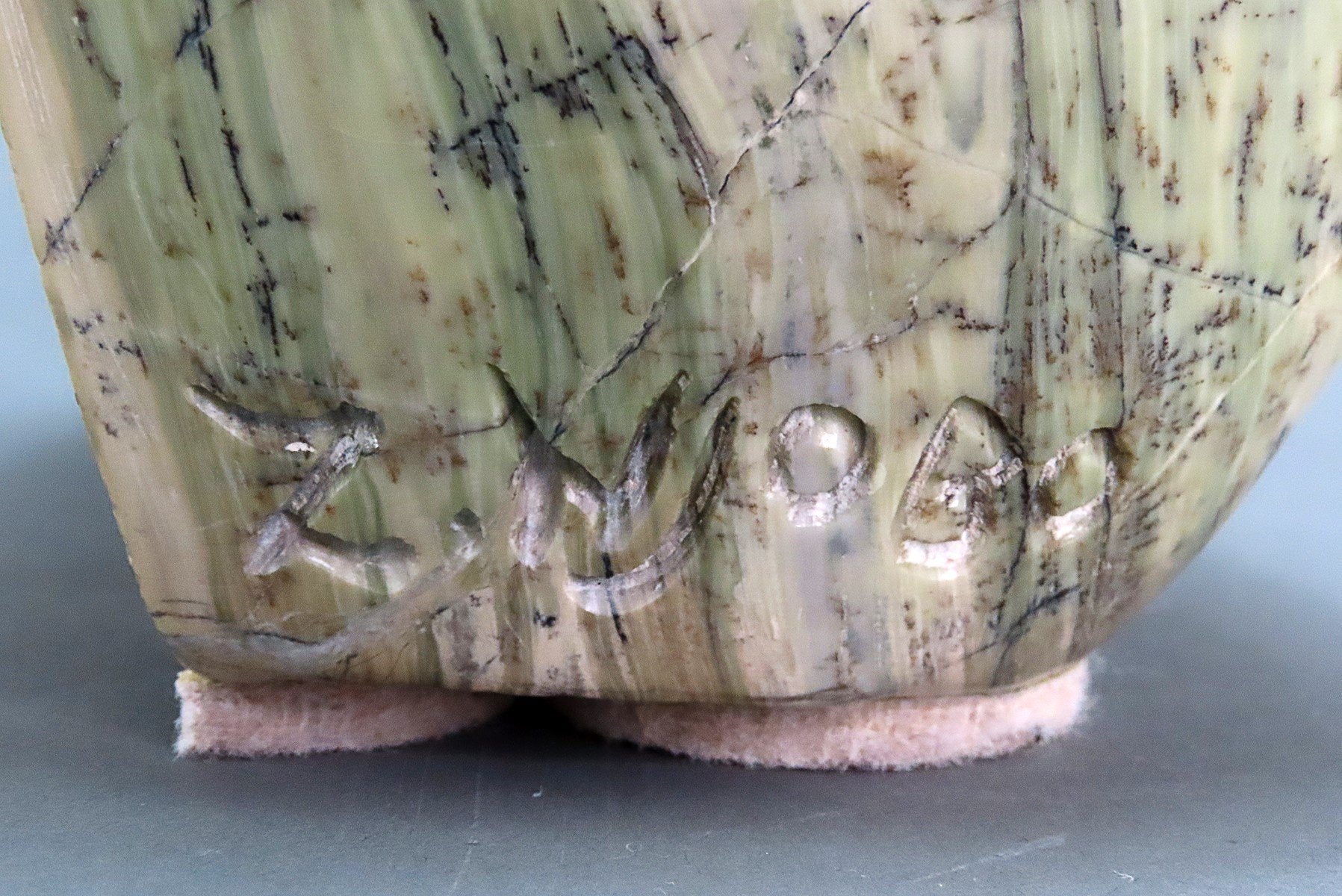 Presented is a whimsical Zimbabwean stone carved owl likely made in the late 20th century by Zachariah Njobo. The stone is full of nice green hues and displays a sitting owl with a wing flat on the side with interested eyes. The back remains unpolished. The stone has a substantial weight. Felt pads have been added to the bottom.