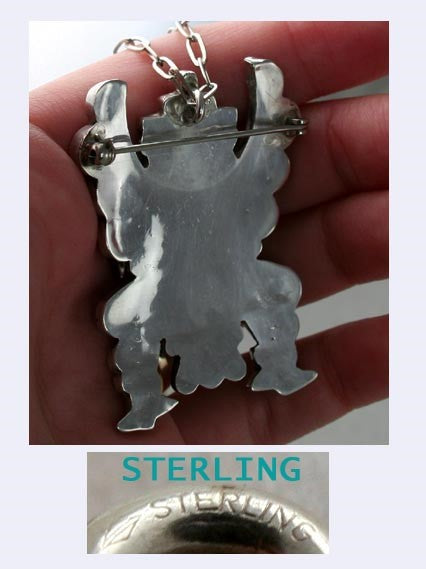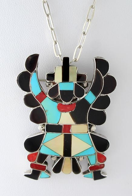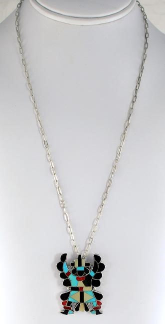 Presented is a quality Native American sterling silver necklace. The necklace has a large pendant of Knifewing, a traditional Zuni deity, made of sterling silver and inlaid with turquoise, onyx, coral, and mother of pearl. The pendant is strung on a handmade chain of sterling silver links. The pendant has a pin back so that it can be removed from the chain and worn as a pin. The necklace was made in the Southwest USA, almost certainly by a Zuni silversmith.
